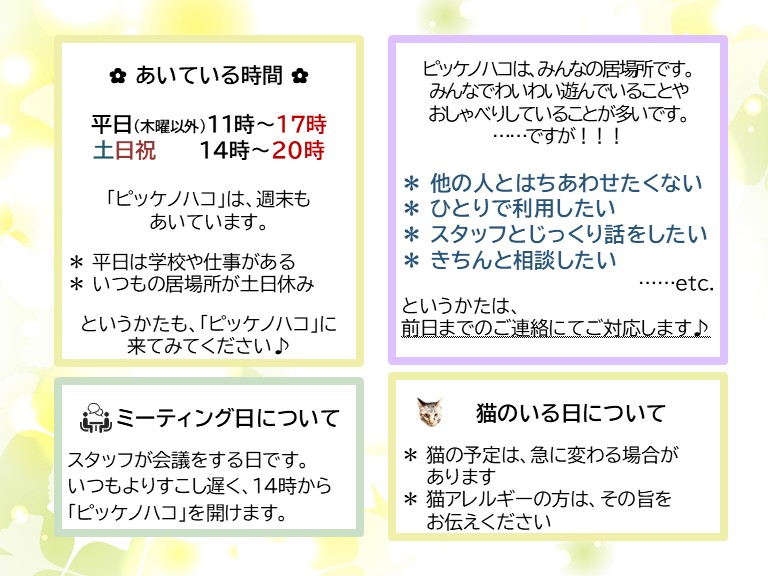 16日(日)は16時~20時で、いつもより少し短縮しての開所になります。