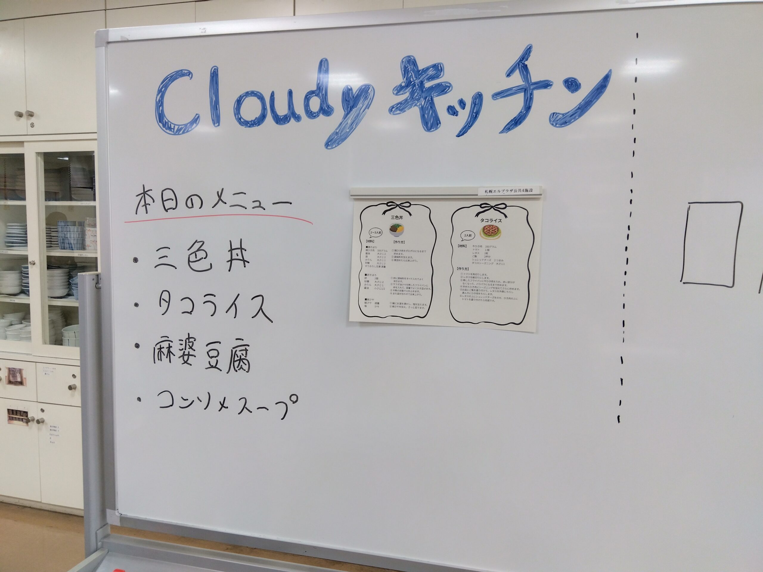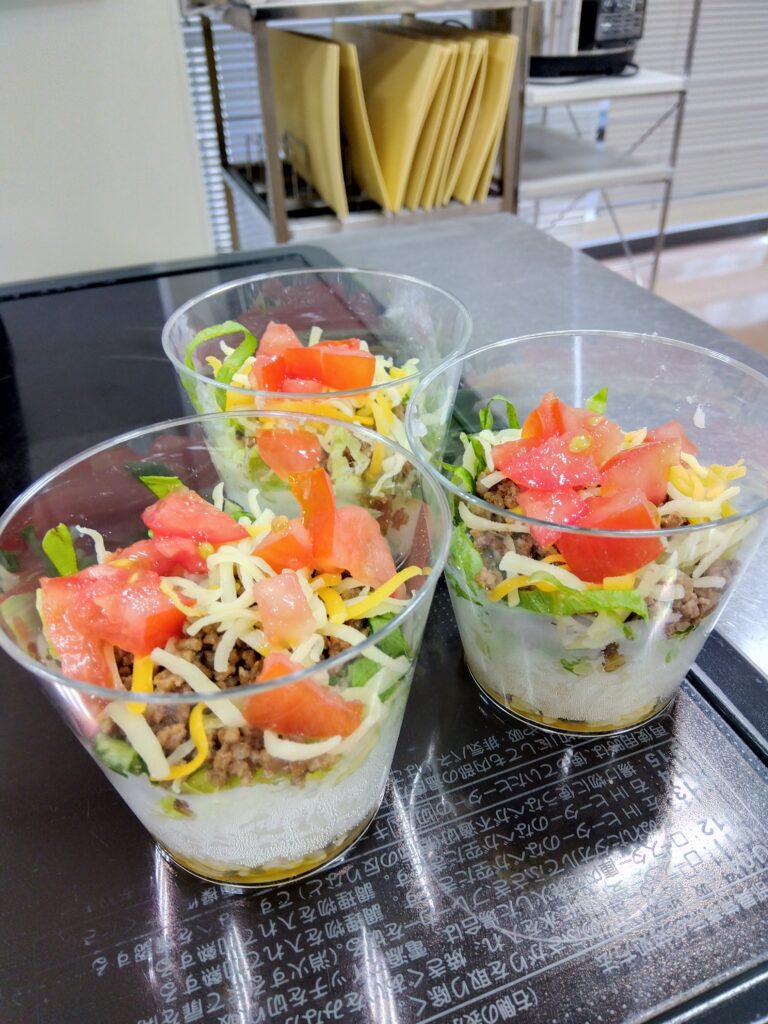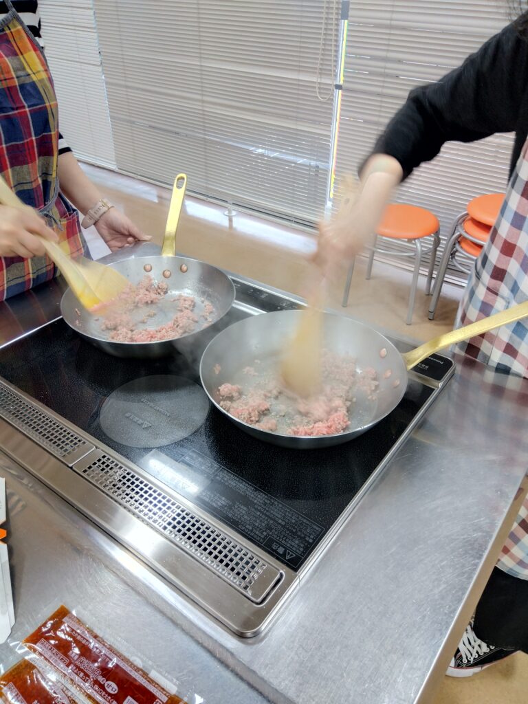 「安くて美味しくて、簡単にできる料理を知りたい」「もらった食料の使い方を知りたい」といった相談者さんからのご意見をもとにした初挑戦です。テーマは「ひき肉」を使った簡単メニュー!!・・・ということで「タコライス」「麻婆豆腐」「三食丼」に決定。皆さん上手に役割分担しながら手際よく作業が進んで、あっという間に完成~🐙🐙